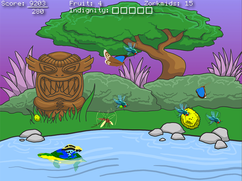 Frog Fractions is the story of a frog who is compelled to defend their fruit stash against hordes of oncoming bugs. Starting with an ordinary tongue, the frog must spend fruit to improve their arsenal with improved offenses, such as a static cling tongue.